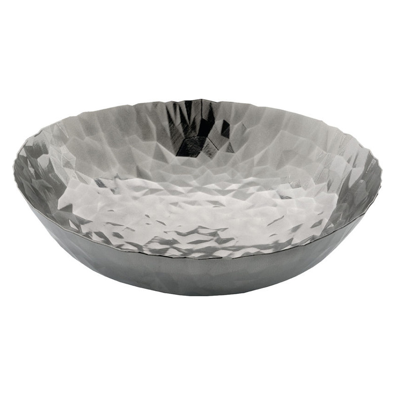 Роскошное блюдо от дизайнера Клаудии Раймондо. Цельный лист нержавеющей стали приобрел элегантную форму и необычный рельеф путем сложной литейной технологии. Игра света и отражений на рельефной поверхности и немного неровные, «незавершенные» края напоминают о старинных изделиях, изготовленных вручную из драгоценных металлов. Блюдо станет великолепным украшением обеденного стола и послужит для эффектной подачи фруктов, закусок или сладостей.