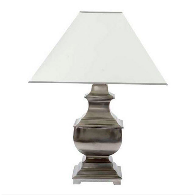 Цветовое решение и внешний вид этой лампы притягивают к себе взгляд . Одна из не многих в коллекции , изготовленная на ножке покрытие которой выполнено из олова . Абажур декорирован кантами серого цвета.
