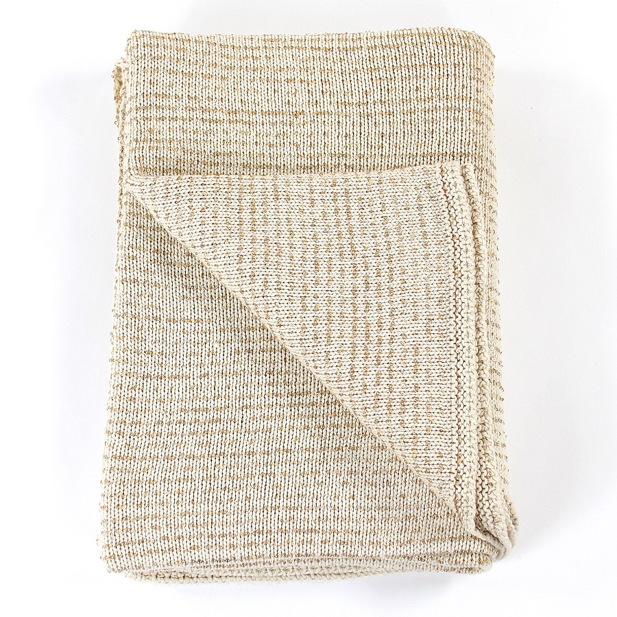 Мягкий плед из 100 чесаного хлопка высшей категории с добавлением золотой нити из люрекса. Благодаря самому высокому сорту хлопка изделие мягкое, воздушное, волокно износостойкое. Добавленная золотая нить создает праздничное настроение. Таким пледом приятно укрыться в холодные зимние вечера, окружив себя настоящей мягкостью и комфортом. Изготовлено на фабрике, работающей с лучшими брендами Европы и США.